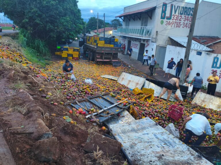 Um caminhão carregado com cerca de 24 toneladas de manga tombou no km 7 da rodovia AMG-2555 após o motorista perder o controle da direção ao passar por uma rotatória. A principal suspeita é de que o deslocamento da carga tenha contribuído para o acidente. Com o tombamento, parte da mercadoria ficou espalhada às margens da rodovia e também em uma via lateral, exigindo a interdição total da pista para o atendimento da ocorrência e retirada do veículo. O condutor ficou preso na cabine e precisou ser retirado pelo Corpo de Bombeiros. Em seguida, ele foi encaminhado pelo SAMU ao Hospital Regional de Uberaba, onde recebeu atendimento médico, passou por exames e foi liberado após sutura em um ferimento no rosto. Além disso, apresentava escoriações pelo corpo. A seguradora acionou guinchos para realizar o destombamento e a remoção do conjunto veicular. Já o proprietário do caminhão providenciou o transbordo das caixas de manga. A carga que permaneceu em boas condições foi liberada para populares, enquanto os produtos danificados foram recolhidos com o auxílio de uma pá carregadeira, com apoio da Prefeitura. Durante os trabalhos de remoção, houve vazamento de óleo diesel na pista. O Corpo de Bombeiros realizou a contenção com serragem, evitando danos ao meio ambiente. A rodovia permaneceu interditada durante toda a operação e foi totalmente liberada ao tráfego após as 20h30 deste domingo (1º).