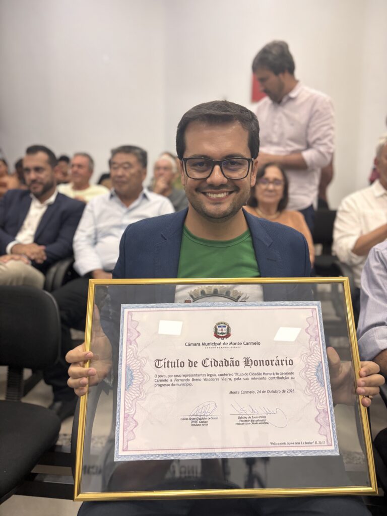 O prefeito de Coromandel (MG) e pré-candidato a deputado estadual, Fernando Breno, recebeu nesta segunda-feira (23) o título de cidadão honorário de Monte Carmelo. A homenagem foi concedida pela Câmara Municipal, por indicação do vereador Professor Caxias. A entrega do título de cidadão honorário é uma das principais honrarias concedidas pelo Legislativo municipal e tem como objetivo reconhecer pessoas que, mesmo não sendo naturais da cidade, contribuíram de forma relevante para o seu desenvolvimento ou para a região. No caso de Fernando Breno, a homenagem reconhece sua atuação política no Cerrado Mineiro e a proximidade com Monte Carmelo, especialmente em pautas ligadas ao desenvolvimento regional. Trajetória política e profissional Fernando Breno construiu sua trajetória a partir de origens simples. Ao longo dos anos, acumulou experiências profissionais diversas, passando por funções como office boy, estagiário, operador de telemarketing, auxiliar administrativo, assessor parlamentar, advogado, professor e produtor rural. Na política, ganhou destaque ao ser eleito vereador em Coromandel, sendo o mais jovem e mais votado em sua eleição. Posteriormente, foi eleito prefeito aos 30 anos e reeleito com ampla maioria de votos, consolidando sua liderança no município. Fernando Breno também foi presidente dos consórcios intermunicipais Amapar, Cisalp e Rides. Lançou ainda o Movimento Sou Mais Cerrado, para fortalecer os municípios do Cerrado Mineiro. O evento promovido para dar start ao projeto contou com a presença de mais de 600 lideranças políticas, incluindo os prefeitos de Uberaba e Uberlândia. “Título aumenta compromisso com a cidade”, diz Fernando Breno O pré-candidato a deputado afirmou que esta segunda-feira foi “um dia muito feliz na vida política e pessoal”, por receber a homenagem. Fernando Breno afirmou que esse título “aumenta o compromisso com a cidade”. “A Grande Coromandel é coirmã de Monte Carmelo. São cidades que dependem da outra em vários sentidos. E devem trabalhar em conjunto”, complementou. Saída da prefeitura e foco na campanha A homenagem ocorre em um momento de transição na carreira do prefeito. Fernando Breno está nos últimos dias à frente da administração municipal de Coromandel. A expectativa é que ele se afaste do cargo no começo de abril para se dedicar integralmente à pré-campanha como candidato a deputado estadual nas eleições deste ano.