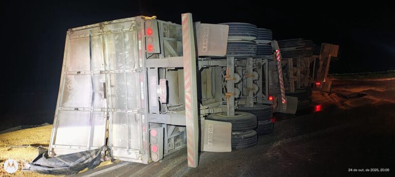 Um caminhoneiro de 49 anos foi autuado pela Polícia Militar Rodoviária (PMRv) após tombar uma carreta carregada de farelo de soja na noite desta sexta-feira (24), no trevo que liga as rodovias MG-223 e MG-190, em Monte Carmelo, no Alto Paranaíba. De acordo com a PMRv, o motorista conduzia uma combinação veicular de carga (CVC) com placas do Espírito Santo, quando perdeu o controle ao acessar o trevo, atingiu o meio-fio, passou sobre a ilha central e acabou tombando. O acidente ocorreu por volta das 19h50, e não houve feridos. Testemunhas contaram que o caminhão “passou direto” pelo trevo, sem realizar a curva. Durante a abordagem, os policiais constataram que o condutor apresentava odor etílico, indicativo de ingestão de bebida alcoólica. Ele recusou o teste do bafômetro, sendo autuado conforme o artigo 277 do Código de Trânsito Brasileiro (CTB). A fiscalização também apontou que um dos pneus do caminhão estava excessivamente desgastado, atingindo o limite dos indicadores de segurança. Diante das irregularidades, foram lavrados autos de infração e o condutor poderá ter a CNH suspensa por até 12 meses. Como o veículo ficou imobilizado e sem condições de remoção imediata, o local foi sinalizado pela equipe policial até a retirada posterior da carga.
