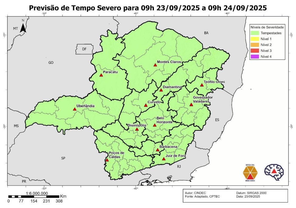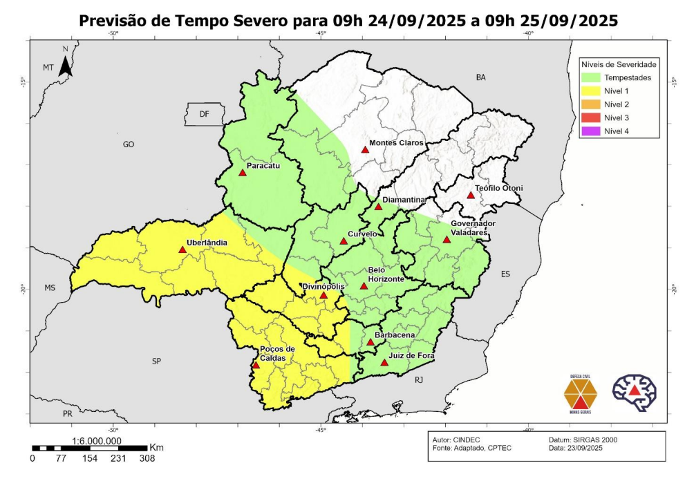 A Coordenadoria Estadual de Defesa Civil de Minas Gerais (Cedec) emitiu um aviso meteorológico, válido até quinta-feira (25), para as regiões do Triângulo Mineiro e Alto Paranaíba, indicando a possibilidade de temporais nessas localidades.