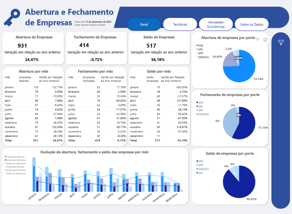 O setor de serviços liderou o movimento, com 665 empresas abertas e 362 fechadas, gerando um saldo positivo de 303 empresas. Já o comércio contabilizou 325 aberturas e 206 encerramentos, saldo de 119 empresas. A indústria também fechou o ano no azul, com saldo de 84 empresas, enquanto a agropecuária, embora com menor participação, apresentou saldo positivo de 21 empresas.