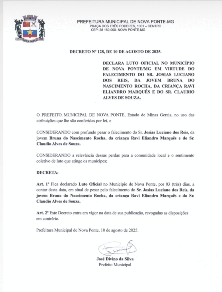 O prefeito de Nova Ponte, José Divino da Silva, decretou luto oficial de três dias após o trágico acidente ocorrido na noite de sábado (9) na BR-452, em Uberlândia, que deixou quatro mortos e 16 feridos. Três das vítimas eram fiéis que retornavam para a cidade, depois de participarem de um culto evangélico no município onde ocorreu a tragédia.