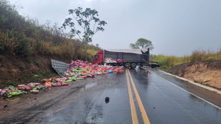 A BR-365 registrou três acidentes envolvendo caminhões em um intervalo de apenas dez minutos, no início da tarde desta quarta-feira (24), na região de Patos de Minas. Os casos ocorreram por volta de 12h, em trechos diferentes da rodovia. De acordo com informações preliminares da Polícia Rodoviária Federal (PRF), os acidentes foram registrados nos quilômetros 424, 414 e 407 da estrada. Ninguém envolvido nos acidentes ficou ferido. Em um dos pontos, um caminhão que transportava rações perdeu o controle, ficou atravessado na pista e parte da carga se espalhou pela rodovia. Em outro trecho, um veículo de carga saiu da pista e acabou obstruindo uma das faixas. Já no terceiro caso, o caminhão capotou e parou na faixa de domínio da BR-365. A PRF informou que equipes foram deslocadas para sinalizar o trânsito e garantir a segurança dos motoristas que passavam pela rodovia. O tráfego chegou a ficar parcialmente interditado em alguns trechos, mas já foi liberado. As causas dos acidentes ainda serão investigadas, mas a chuva repentina que atingiu a região no horário é apontada como fator determinante para a perda de controle dos veículos.