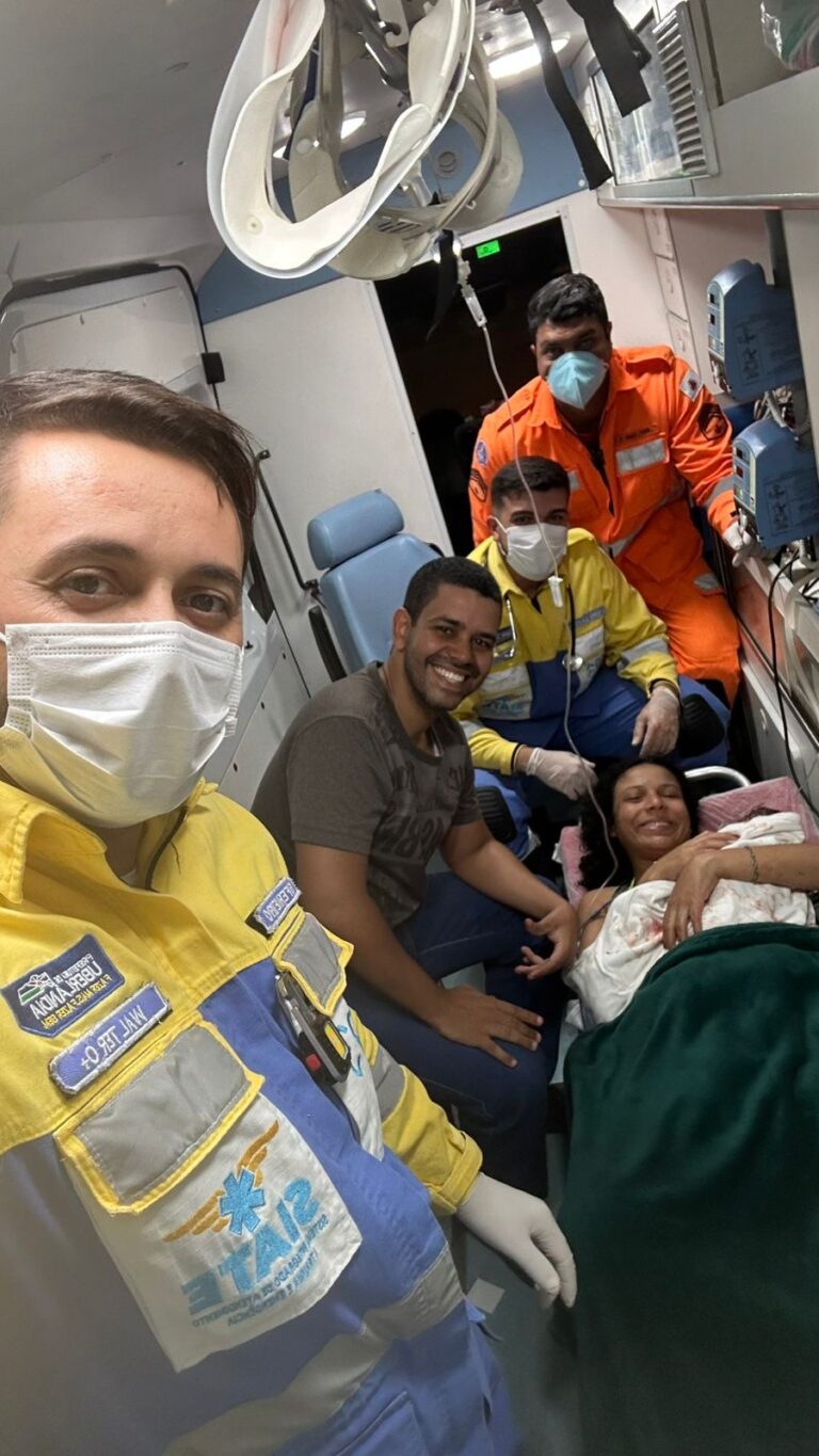 Na madrugada deste sábado (23), um parto emocionante marcou a rotina do Corpo de Bombeiros Militar de Minas Gerais em Uberlândia. Por volta de 00h30, a guarnição foi acionada para atender a senhora Flávia, de 29 anos, no bairro Jardim Europa, que se encontrava em trabalho de parto ativo com 39 semanas de gestação. Ao chegarem, o 2º Sargento Lima, o médico Pedro Sales e o enfermeiro Walter encontraram a gestante já em coroamento, momento que indica a iminência do nascimento. Com rapidez e segurança, a equipe iniciou os procedimentos necessários, oferecendo suporte à mãe e garantindo a estabilização nos primeiros minutos críticos. Nascimento no trajeto Diante da situação, a guarnição optou por realizar o transporte imediato ao hospital, mantendo monitoramento constante. No entanto, durante o deslocamento, o parto se concretizou dentro da própria viatura, dando à luz ao pequeno Túlio José. O bebê foi recebido com alegria pela mãe, pelo pai, Marco, que acompanhava a cena, e pela equipe de resgate que testemunhou o momento especial. Após o nascimento, mãe e filho foram encaminhados ao hospital, em boas condições de saúde.